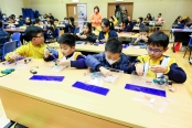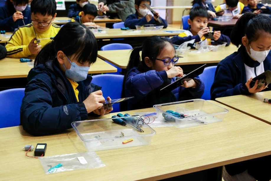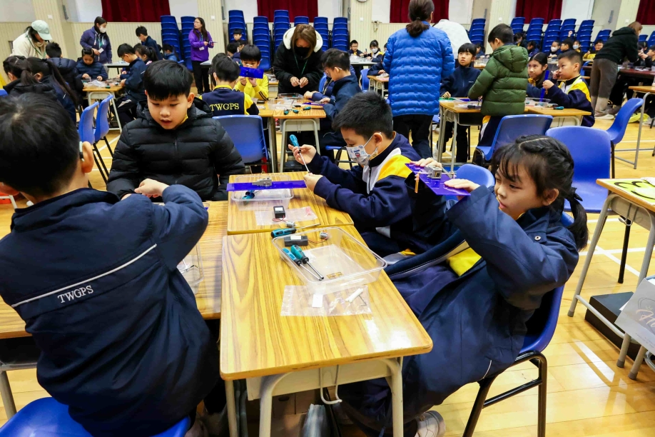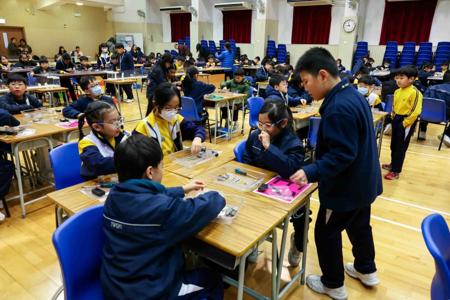 08/01/2026本校四年級學生於一月八日在禮堂分組參與 STEAM DAY。同學們運用齒輪、木條、木塊、膠板、電池及雙星模型,親手裝嵌「蹦跳機械人」,展開了一場充滿創意與挑戰的學習體驗。