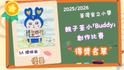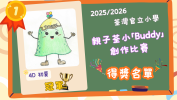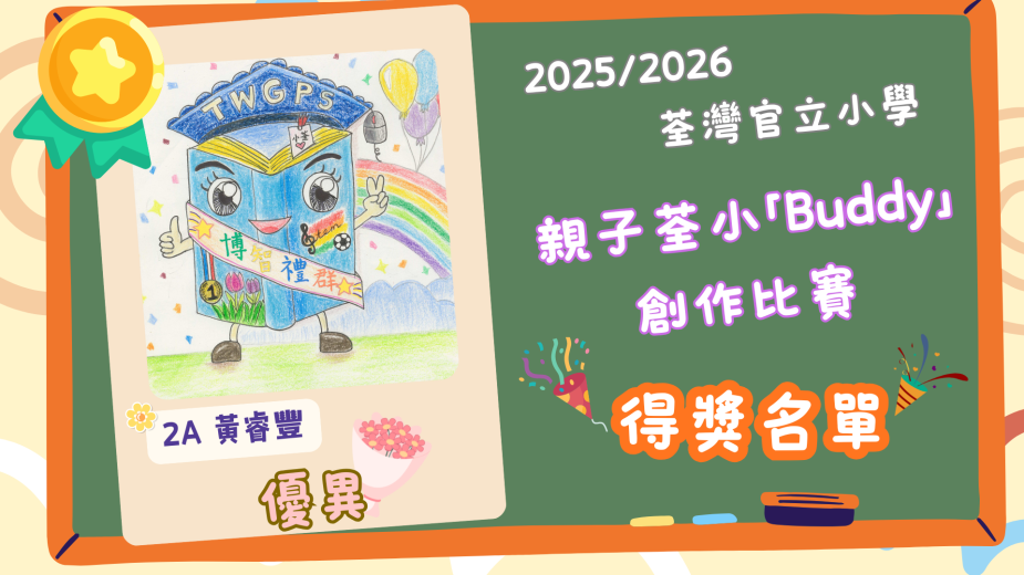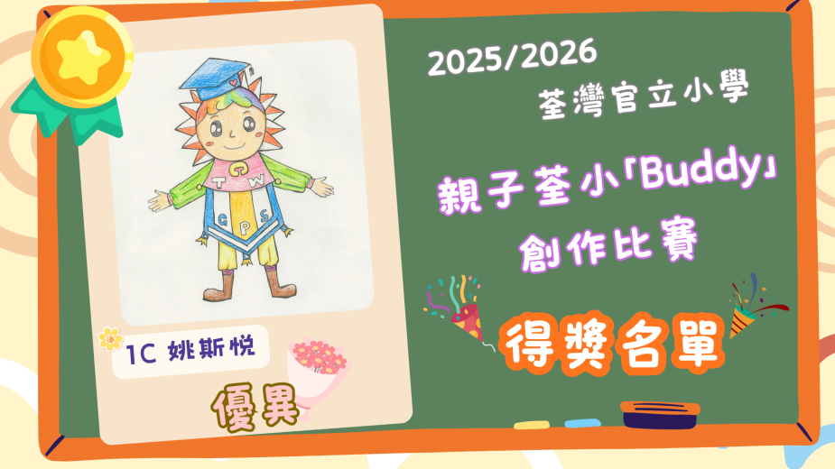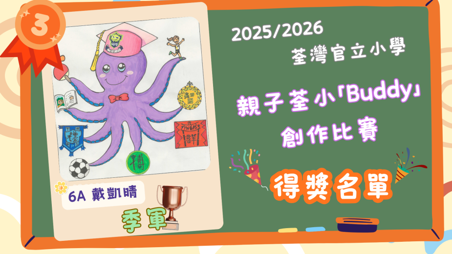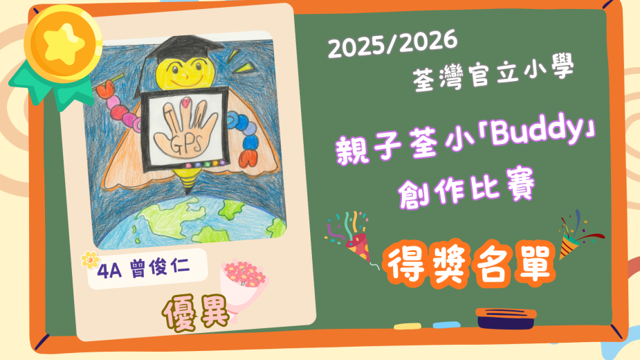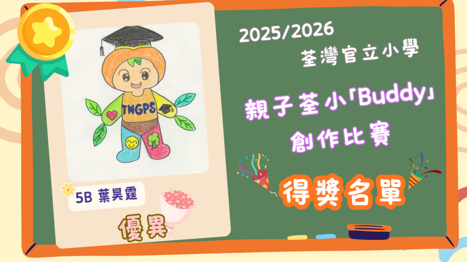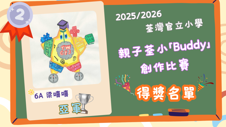 冠軍作品由4D初夏同學設計主題「荃小山伴」以大帽山為靈感,設計以簡潔線條傳遞深厚寓意︰學校如山般穩固,陪伴每個荃小學子在知識與品格的山徑上踏實成長,一步步快樂攀登。色調融合山巒綠代表成長與堅毅;暖陽黃則象徵智慧與溫暖,呼應荃小「博、智、禮、群」的精神,長成了頭上學社的四色小花。