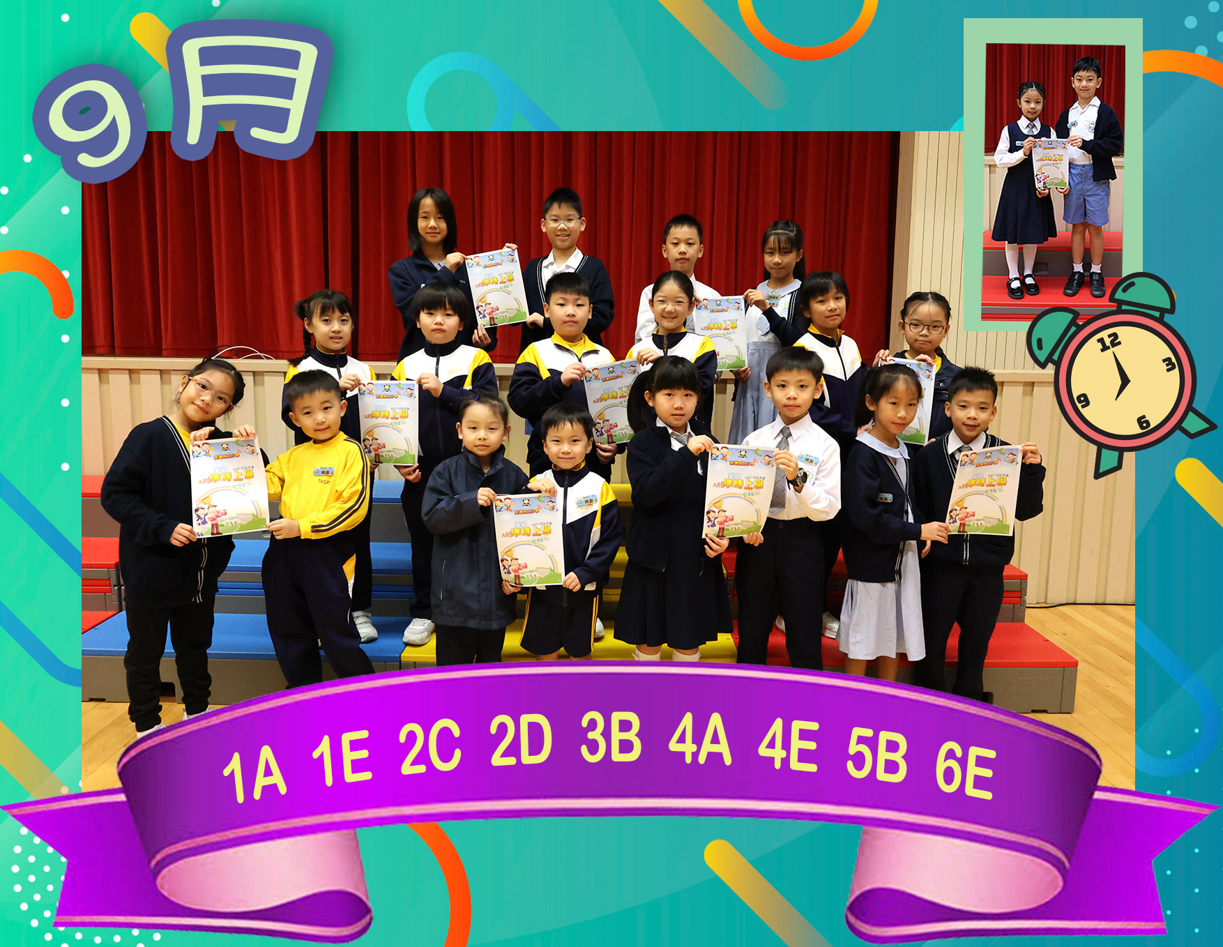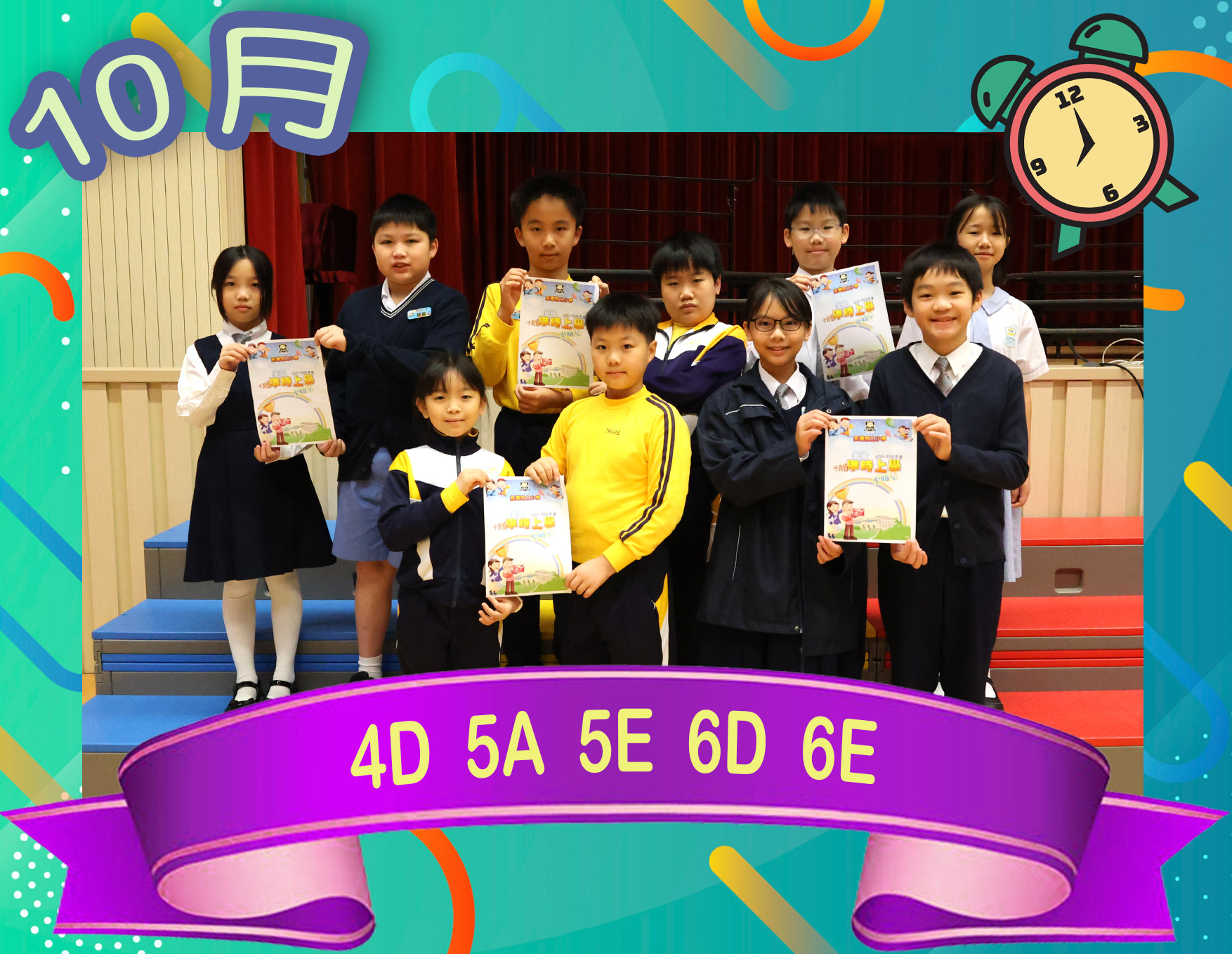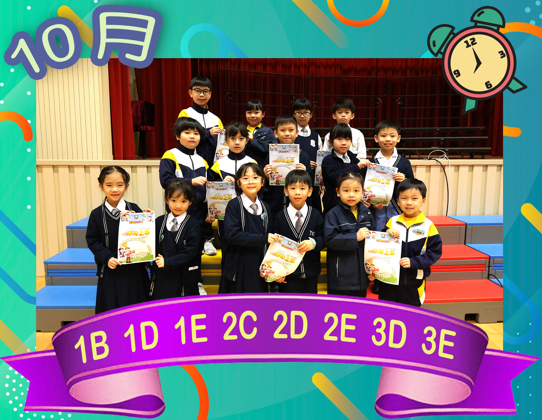 為了鼓勵同學養成準時上學的良好習慣,學校於九月份舉辦了「全班準時上學至叻星」活動!老師盼望同學們每天能早睡早起,準時上學,齊心為班別爭取「全班準時上學至叻星」的榮譽!